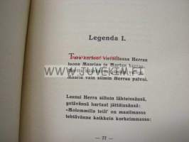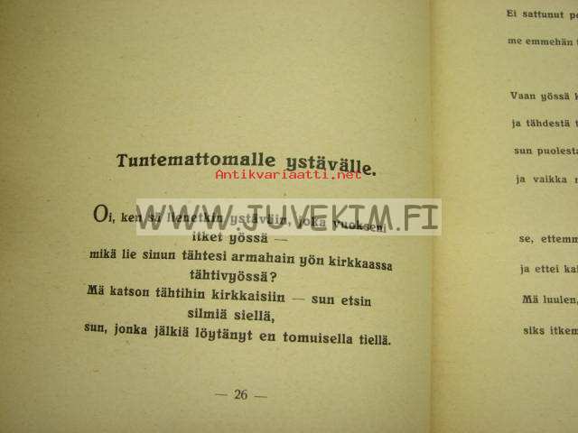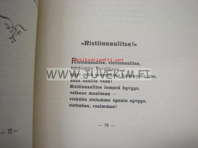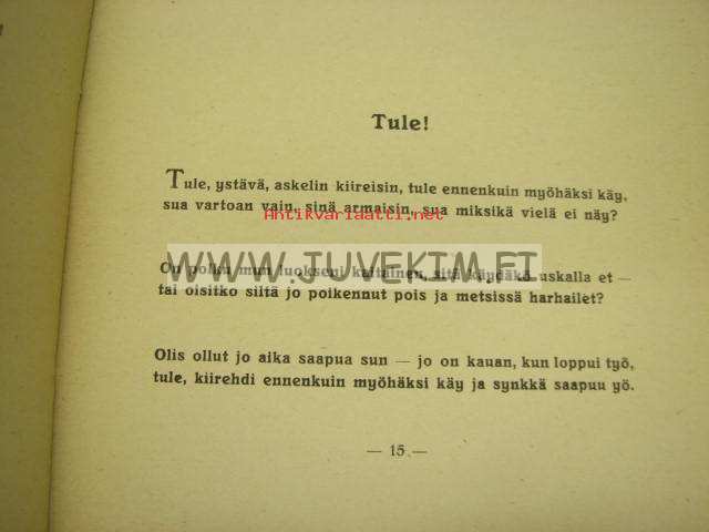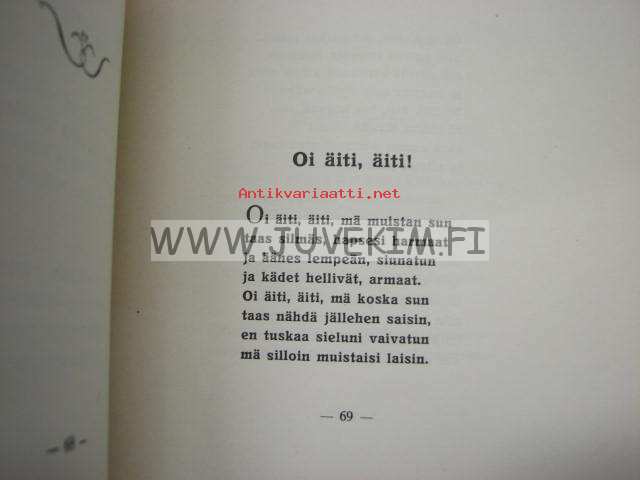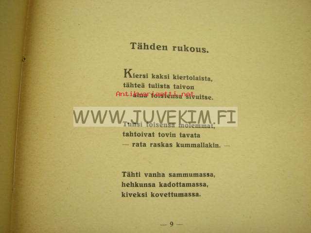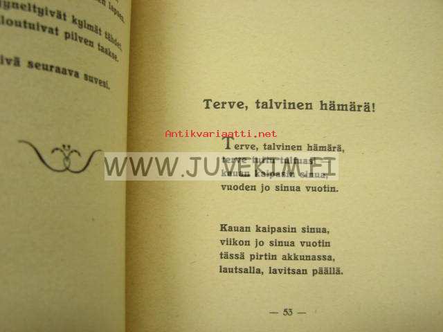 | Saatavilla | 1 kpl | | Julkaisuvuosi | 1928 | | Sivuja | 86 | | Painos | 1. | | Kunto | K2 | | Sidonta/painoasu | Nidottu (pehmeäk.) | | Kielet | Suomi |