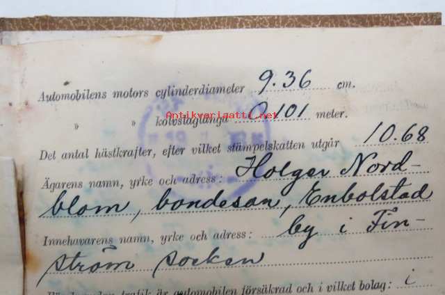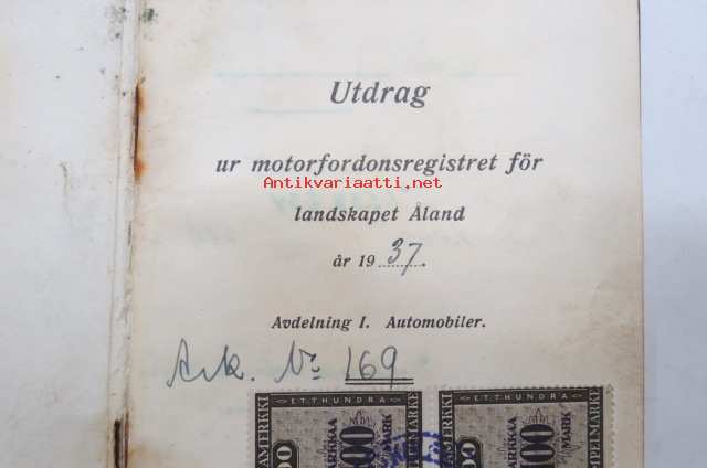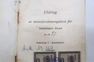 Chevrolet personbil / henkilöauto, ägare / omistaja Holger Nordblom (Embolstad, Finström) & Ruben Johansson, Näs, Saltvik) -registerutdrag / rekisteriote 1937-38