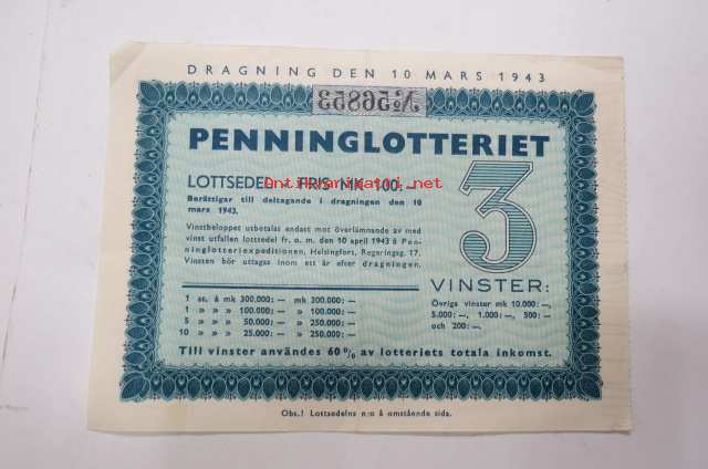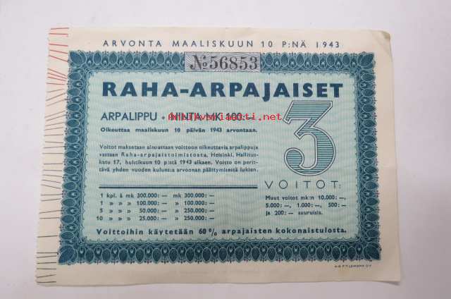 Raha-arpa, Raha-arpajaiset / Penninglotteriet, lottsedel maaliskuu 1943 nr 56853 -lottery ticket