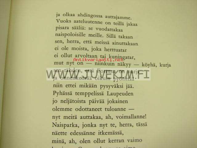 | Saatavilla | 1 kpl | | Julkaisuvuosi | 1962 | | Sivuja | 613 | | Painos | 1 | | Kunto | K3 | | Sidonta/painoasu | Sidottu (kovak.) | | Kielet | Suomi |