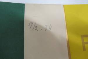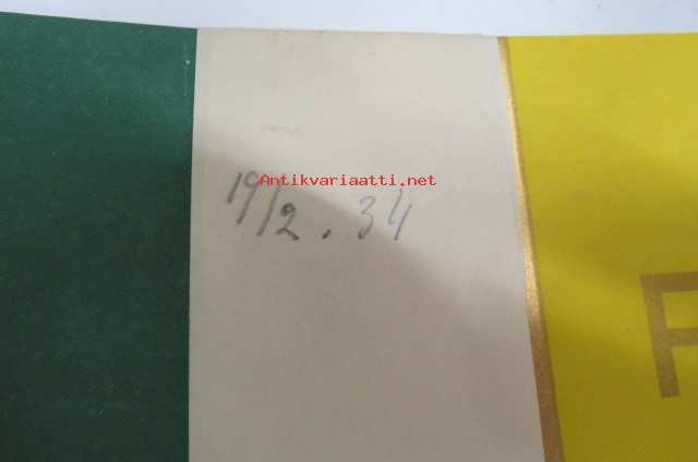 | Saatavilla | 20 kpl | | Julkaisuvuosi | 1934 | | Sivuja | 1 | | Kunto | K3 | | Sidonta/painoasu | Pienpainate |