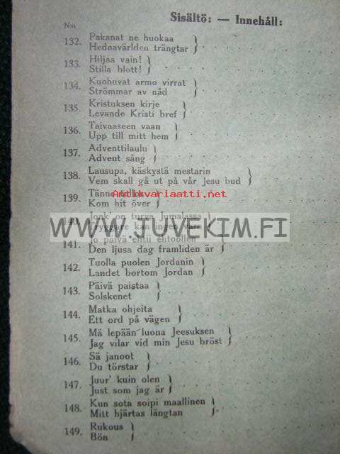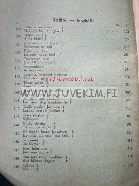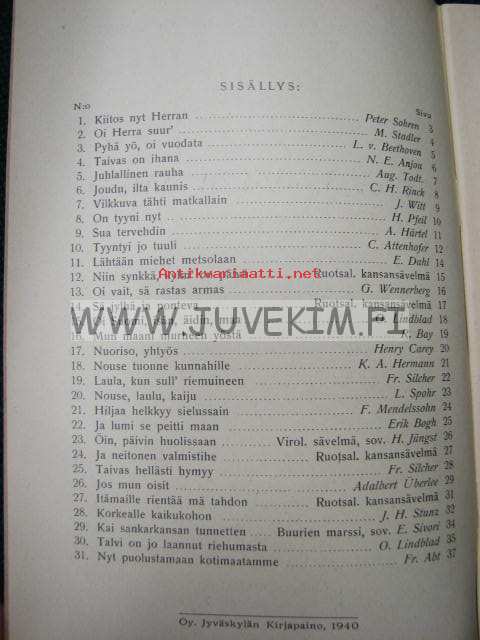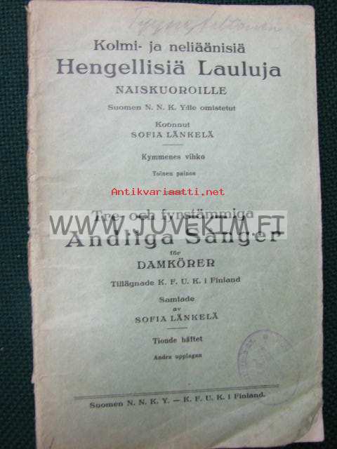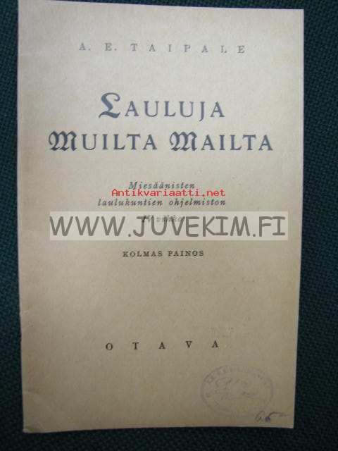 | Saatavilla | 1 kpl | | Julkaisuvuosi | 1940 | | Sivuja | 40 | | Painos | 3 | | Kunto | K3 | | hyvä | | Sidonta/painoasu | Vihko | | Kielet | Suomi |