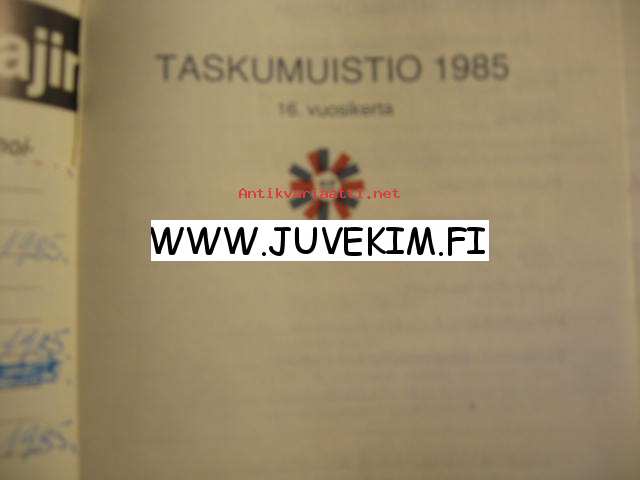 | Saatavilla | 1 kpl | | Julkaisuvuosi | 1985 | | Kunto | K2 | | Sisältää kirjoitusta | | Sidonta/painoasu | Nidottu (pehmeäk.) | | Kielet | Suomi |