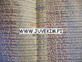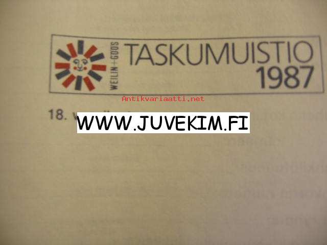| Saatavilla | 1 kpl | | Julkaisuvuosi | 1987 | | Kunto | K2 | | Sisältää kirjoitusta | | Sidonta/painoasu | Nidottu (pehmeäk.) | | Kielet | Suomi |