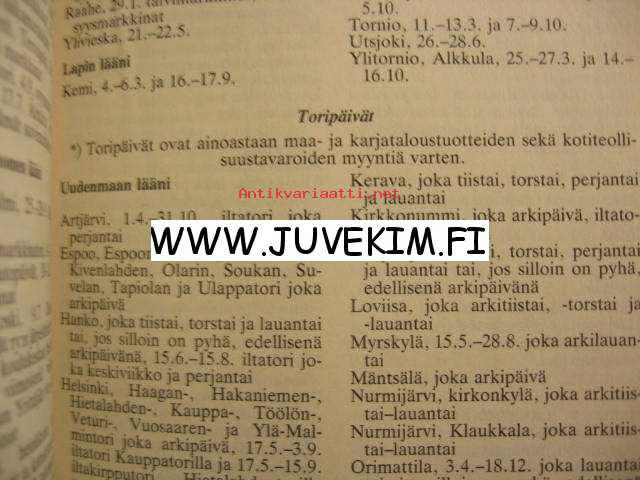 | Saatavilla | 1 kpl | | Julkaisuvuosi | 1993 | | Kunto | K2 | | Sisältää kirjoitusta | | Sidonta/painoasu | Nidottu (pehmeäk.) | | Kielet | Suomi |