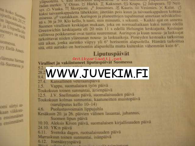 | Saatavilla | 1 kpl | | Julkaisuvuosi | 1994 | | Kunto | K2 | | Sisältää kirjoitusta | | Sidonta/painoasu | Nidottu (pehmeäk.) | | Kielet | Suomi |