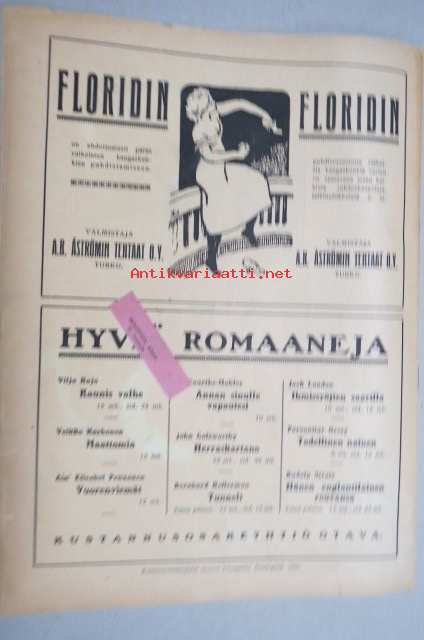 | Saatavilla | 2 kpl | | Julkaisuvuosi | 1920 | | Kunto | K2 | | Sidonta/painoasu | Lehti | | Kielet | Suomi |