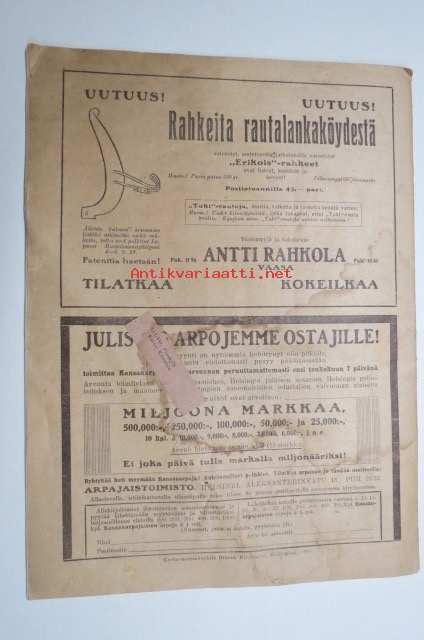 | Saatavilla | 2 kpl | | Julkaisuvuosi | 1920 | | Kunto | K2 | | Sidonta/painoasu | Lehti | | Kielet | Suomi |