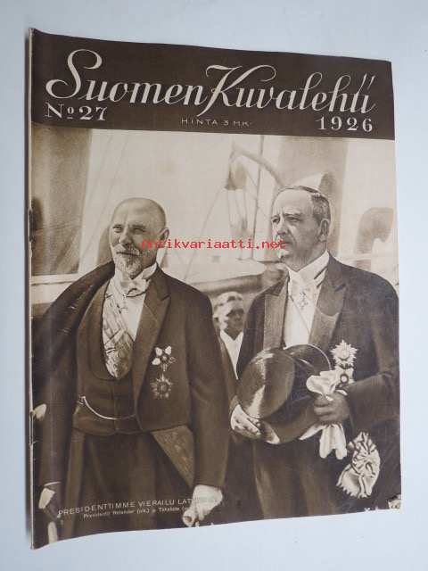 Suomen Kuvalehti 1926 nr 27, kansikuva Presidenttimme vierailu Latviassa, Sortavalan laulu- ja soittojuhlat, Kesämatkoista maassamme, Naantalin aurinkoinen, ym.