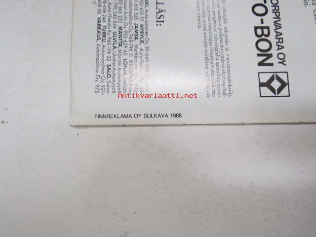 | Saatavilla | 1 kpl | | Julkaisuvuosi | 1988 | | Sivuja | 4 | | Kunto | K3 | | Sidonta/painoasu | Pienpainate | | Kielet | Suomi |
