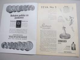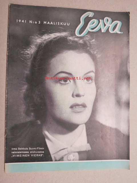 Eeva 1941 nr 3 kansikuva Irma Seikkula Suomi-Filmin valmistamassa elokuvassa - Viimeinen vieras, Suomalaisen teatterin villiruusu, Rakkautta Suomea kohtaan, ym.