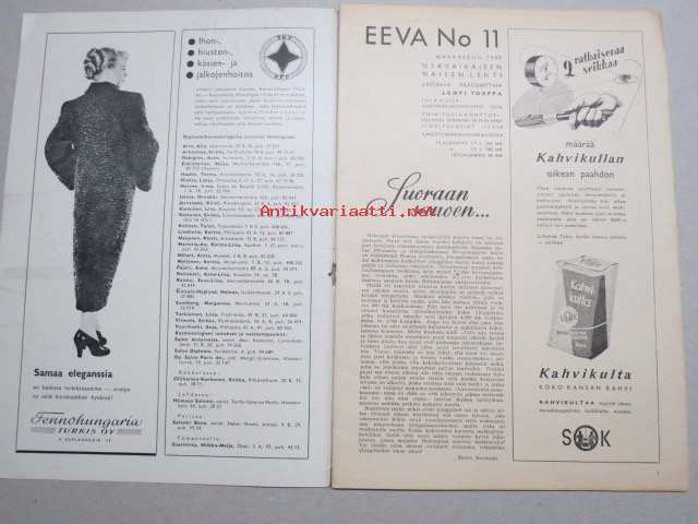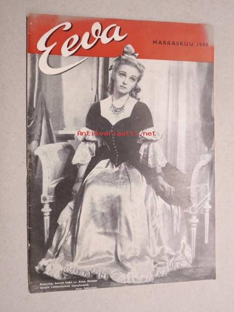 Eeva 1948 nr 11 kansikuva Katarina, kaunis leski, Sepä oli loistava juhla..., Kohtalo ohjaa, Minkälaiset ovat romanttiset sääret?, Illallistanssiaiset Turussa, ym.