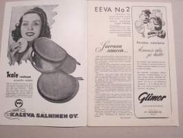 Eeva 1945 nr 2 kansikuva Laila Jokimo, Nainen ja hormoonit, Baletin pojat, Äiti kohtaloita, Normaalin ihon kotihotoa, Matkustava tukholmatar pukeutuu näin, ym.