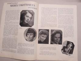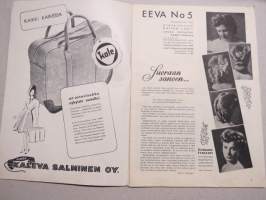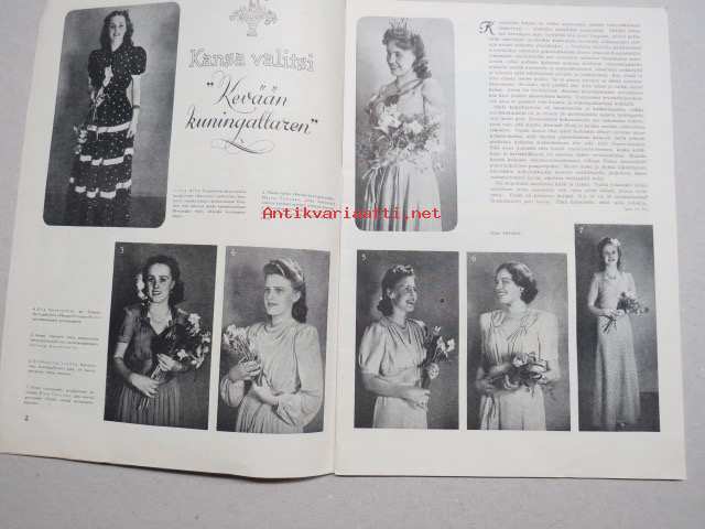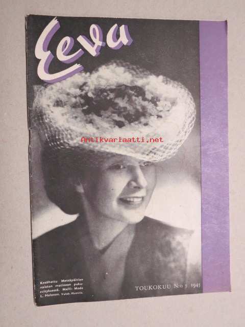 Eeva 1945 nr 5 kansikuva Kesähattu Metsäpäivien naisten matinean pukuesityksessä, Kansa valitsi Kevään kuningattaren, Annetaanko miehen uskottomuus anteeksi?, ym.