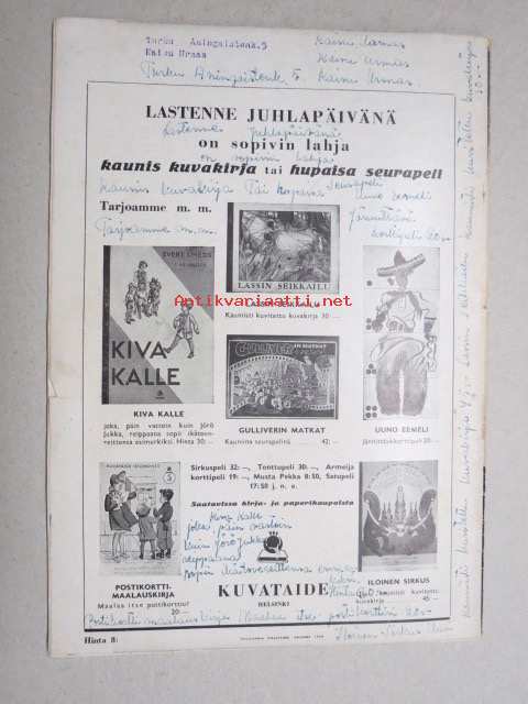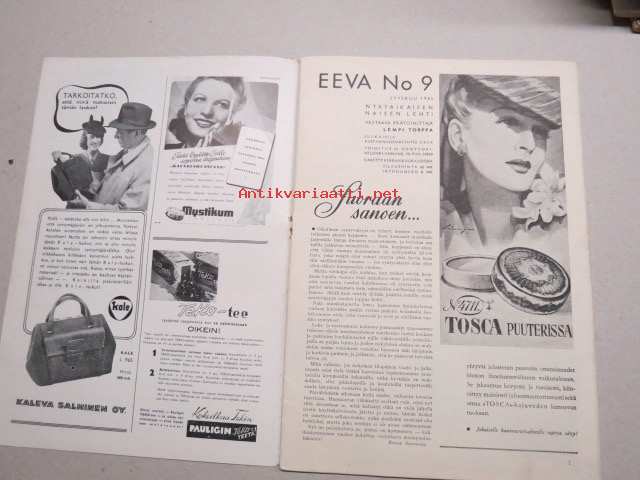 Eeva 1943 nr 9 Kameliat tuoksuvat, Leikkiä se on kun tupakka loppuu - tuskaa kun tupakka loppuu, Ensimmäinen rakkauteni - Ruotsalainen insinööri putoaa junasta, ym.