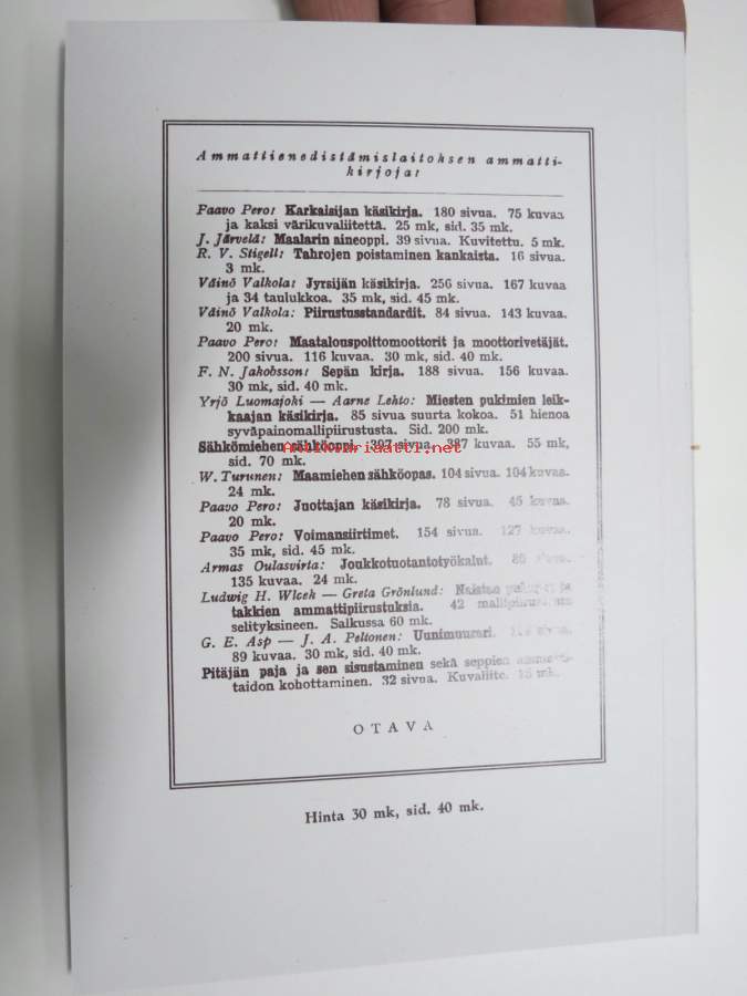 | Saatavilla | 8 kpl | | Julkaisuvuosi | 1932 | | Sivuja | 114 | | Kunto | K3 | | Kopio - näköispainos | | Sidonta/painoasu | Nidottu (pehmeäk.) | | Kielet | Suomi |