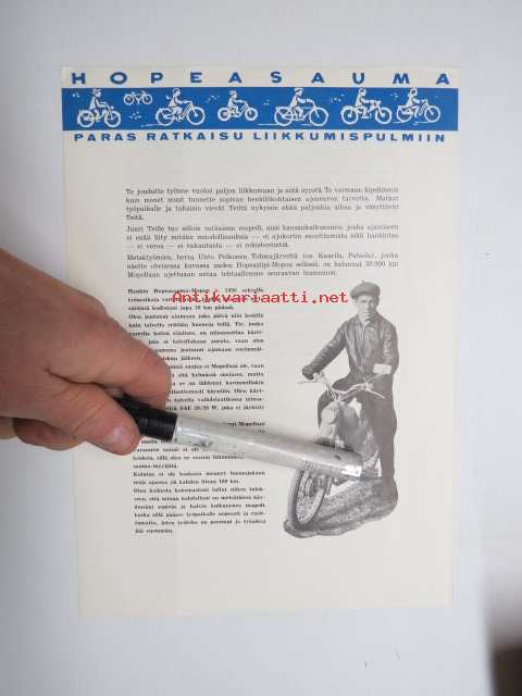 Hopeasauma mopot -myyntiesite / vuodelta 1957, kuvassa metsätyömies Herra unto Pelkonen (Kaurila, Patsola)