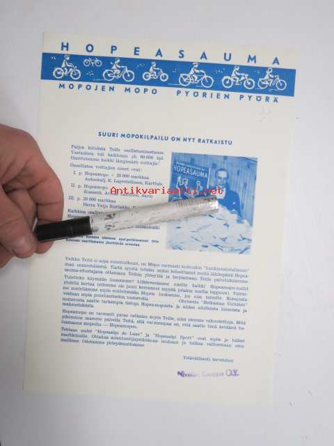 Hopeasauma mopokilpailu - voittajaluettelo (Leima: Nivalan kauppa Oy), voittajat; K. Lapveteläinen - Karttula, Armas Lahtinen - Savio, Veijo Kurtakko - Kolari
