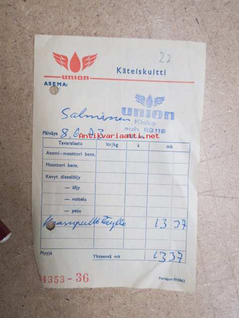 Union huoltoasema Kisko -käteiskuitti 8.6.1973