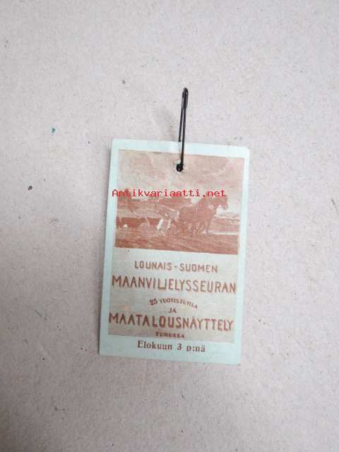Lounais-Suomen Maanviljelysseuran 25-vuotisjuhla ja maatalousnäyttely Turussa -osallistujamerkki / edustajamerkki / pääsylippu
