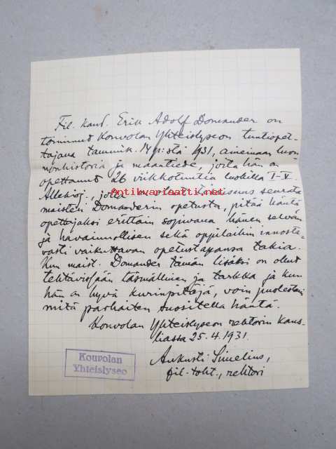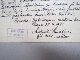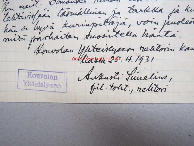 Kouvolan Yhteislyseo, 1931 -asiakirja, allekirjoitus Aukusti Simelius