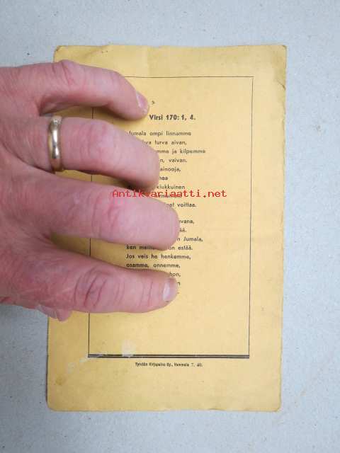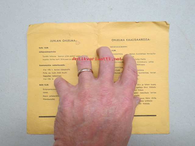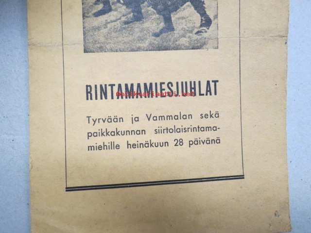 | Saatavilla | 1 kpl | | Julkaisuvuosi | 1940 | | Sivuja | 4 | | Kunto | K2 | | Sidonta/painoasu | Pienpainate | | Kielet | Suomi |