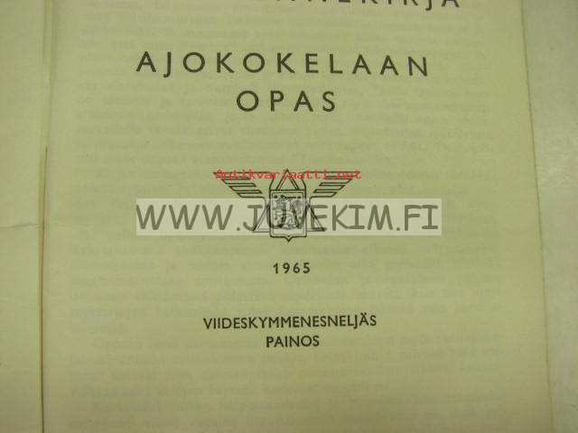 | Saatavilla | 1 kpl | | Julkaisuvuosi | 1965 | | Sivuja | 91 | | Painos | 54. | | Kunto | K3 | | Sidonta/painoasu | Nidottu (pehmeäk.) | | Kielet | Suomi |