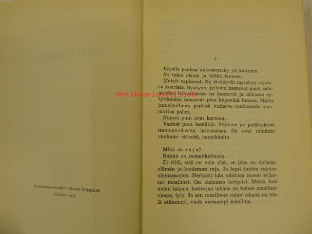 | Saatavilla | 1 kpl | | Julkaisuvuosi | 1955 | | Sivuja | 256 | | Painos | 1. | | Kunto | K4 | | Sidonta/painoasu | Nidottu (pehmeäk.) | | Kielet | Suomi |