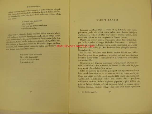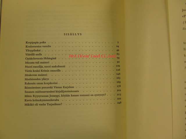 | Saatavilla | 1 kpl | | Julkaisuvuosi | 1956 | | Sivuja | 263 | | Painos | 2. | | Kunto | K3 | | Sidonta/painoasu | Nidottu (pehmeäk.) | | Kielet | Suomi |