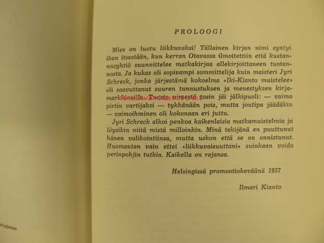 | Saatavilla | 1 kpl | | Julkaisuvuosi | 1957 | | Sivuja | 296 | | Painos | 1. | | Kunto | K3 | | Sidonta/painoasu | Sidottu (kovak.) | | Kielet | Suomi |