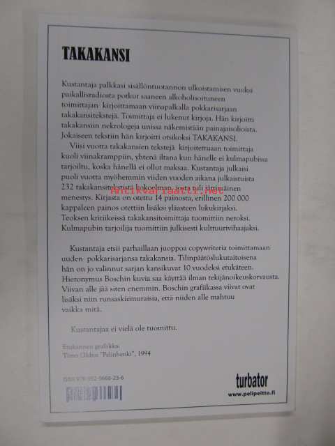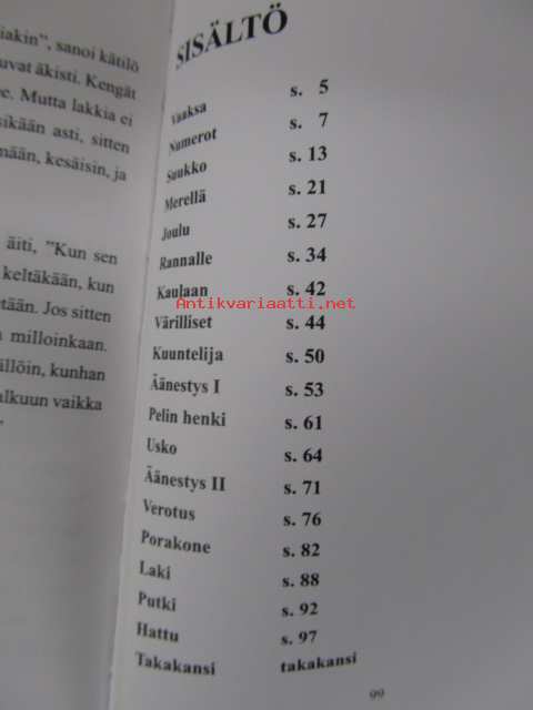 | Saatavilla | 1 kpl | | Julkaisuvuosi | 2008 | | Sivuja | 99 | | Painos | 1. | | Kunto | K3 | | Sidonta/painoasu | Nidottu (pehmeäk.) | | ISBN | 978-952-5666-23-6 | | Kielet | Suomi |