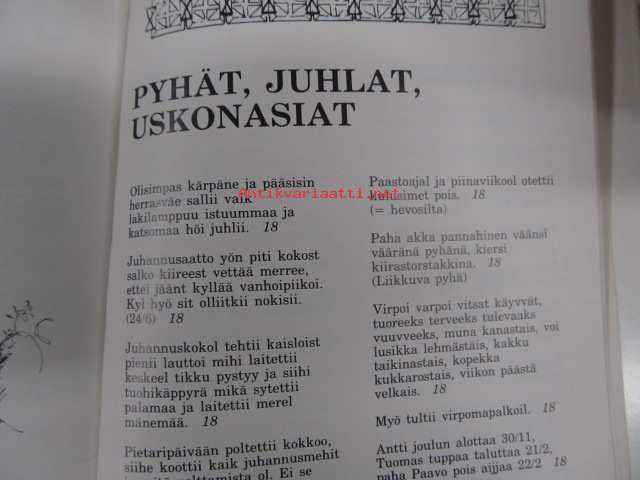 | Saatavilla | 1 kpl | | Julkaisuvuosi | 1987 | | Sivuja | 230 | | Painos | 1. | | Kunto | K3 | | Sidonta/painoasu | Sidottu (kansipaperit) | | ISBN | 951-99886-5-3 | | Kielet | Suomi |