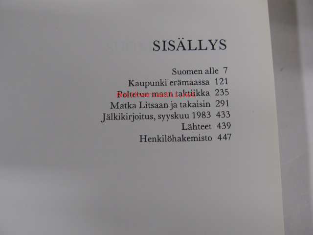 | Saatavilla | 1 kpl | | Julkaisuvuosi | 1983 | | Sivuja | 457 | | Painos | 1. | | Kunto | K3 | | Sidonta/painoasu | Sidottu (kovak.) | | ISBN | 951-1-07631-0 | | Kielet | Suomi |