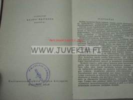 | Saatavilla | 1 kpl | | Julkaisuvuosi | 1948 | | Sivuja | 194 | | Painos | 1. | | Kunto | K2 | | Kulunut, kirjastoleimoja | | Sidonta/painoasu | Sidottu (kovak.) | | Kielet | Suomi |