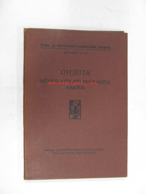 | Saatavilla | 1 kpl | | Julkaisuvuosi | 1928 | | Sivuja | 54 | | Painos | 1. | | Kunto | K3 | | Sidonta/painoasu | Sidottu (kovak.) | | Kielet | Suomi |