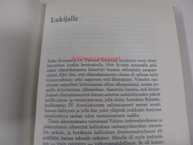 | Saatavilla | 1 kpl | | Julkaisuvuosi | 1972 | | Sivuja | 249 | | Painos | 2. | | Kunto | K5 | | Sidonta/painoasu | Sidottu (kansipaperit) | | ISBN | 951-30-2324-9 | | Kielet | Suomi |
