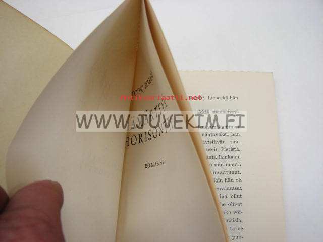 | Saatavilla | 1 kpl | | Julkaisuvuosi | 1944 | | Sivuja | 172 | | Painos | 1. | | Kunto | K3 | | Sivut aukileikkaamatta | | Sidonta/painoasu | Nidottu (pehmeäk.) | | Kielet | Suomi |
