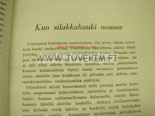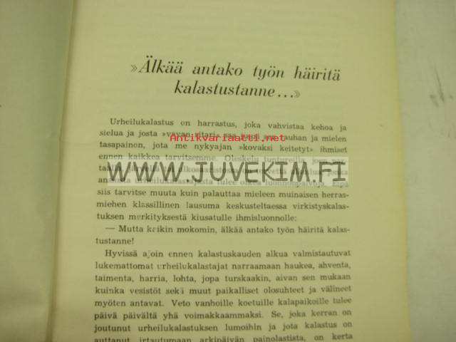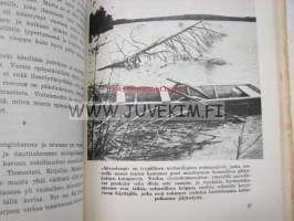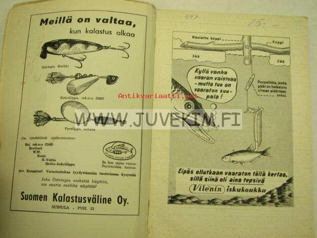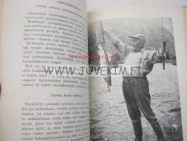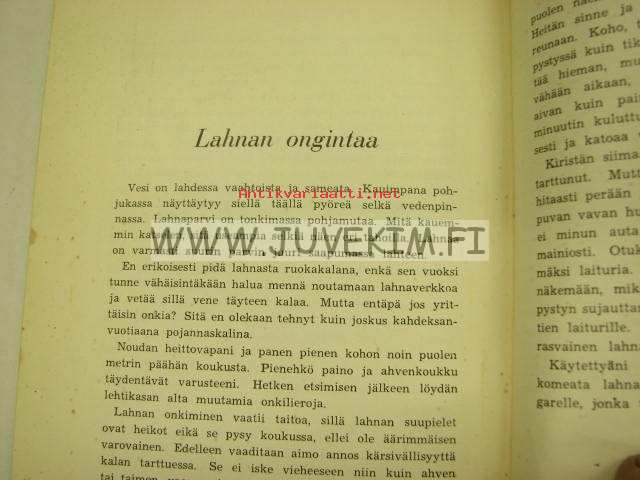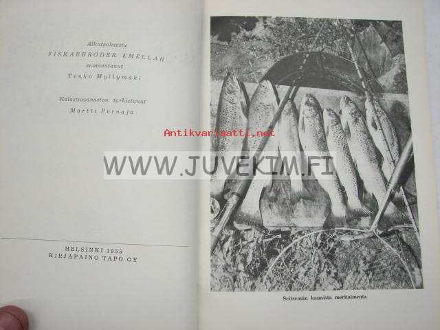 15 x 21 cm kirja. Alkuteos: Fiskarbröder emellan, suomentanut Tenho Myllymäki. Kalastussanaston tarkastanut Martti Pernaja. Sis. kertomuksia. Paljon mustavalkoisia valokuvia. Pehmeäkantinen, reunat kuluneet, ja takasivu sotkettu, tekstisivut hyvät.