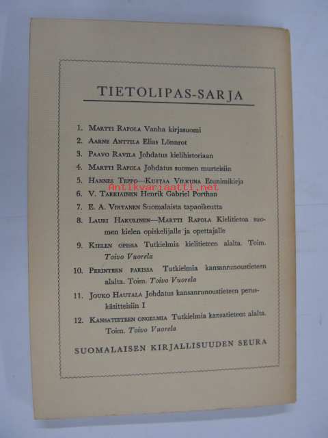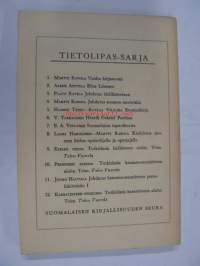 | Saatavilla | 1 kpl | | Julkaisuvuosi | 1957 | | Sivuja | 0187 | | Painos | 1. | | Kunto | K3 | | Sidonta/painoasu | Nidottu (pehmeäk.) | | Kielet | Suomi |