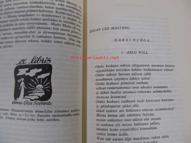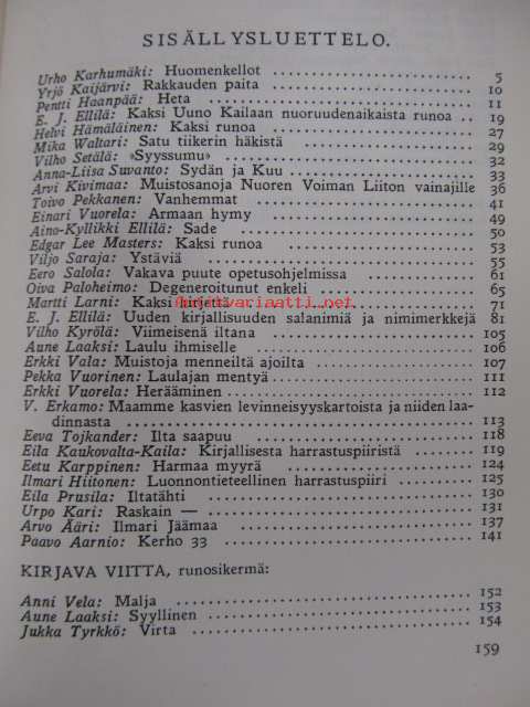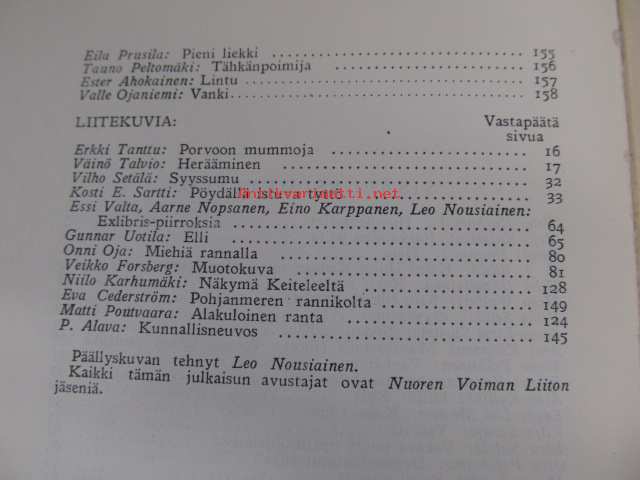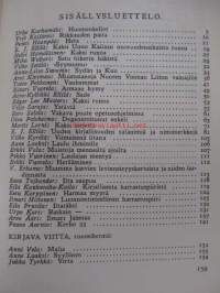 | Saatavilla | 1 kpl | | Julkaisuvuosi | 1946 | | Sivuja | 157 | | Painos | 1. | | Kunto | K2 | | Sidonta/painoasu | Nidottu (pehmeäk.) | | Kielet | Suomi |