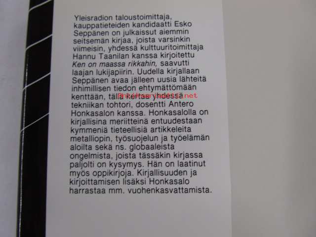 | Saatavilla | 1 kpl | | Julkaisuvuosi | 1984 | | Sivuja | 225 | | Painos | 1. | | Kunto | K3 | | Sidonta/painoasu | Sidottu (kansipaperit) | | ISBN | 951-20-2618-x | | Kielet | Suomi |