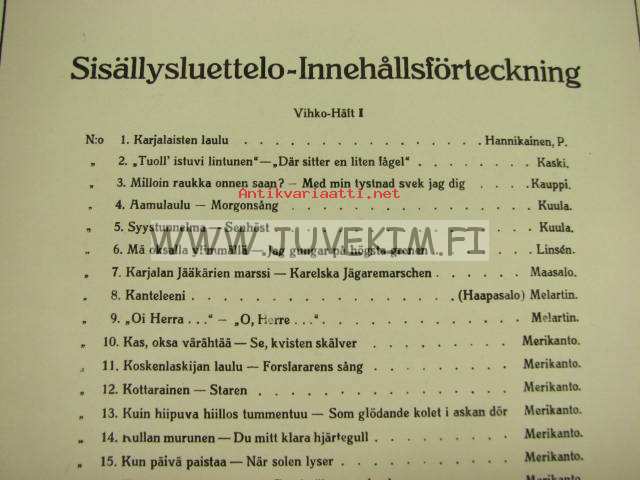 | Saatavilla | 1 kpl | | Julkaisuvuosi | 19?? | | Sivuja | 15 | | Kunto | K3 | | Sidonta/painoasu | Nidottu (pehmeäk.) | | Kielet | Suomi |